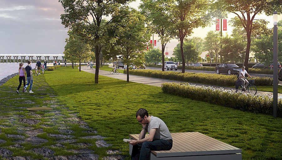 The boulevard will have a green corridor with features that give people a closer access to the St. Lawrence River. It will also include dedicated active mobility lanes, which the sector currently lacks.