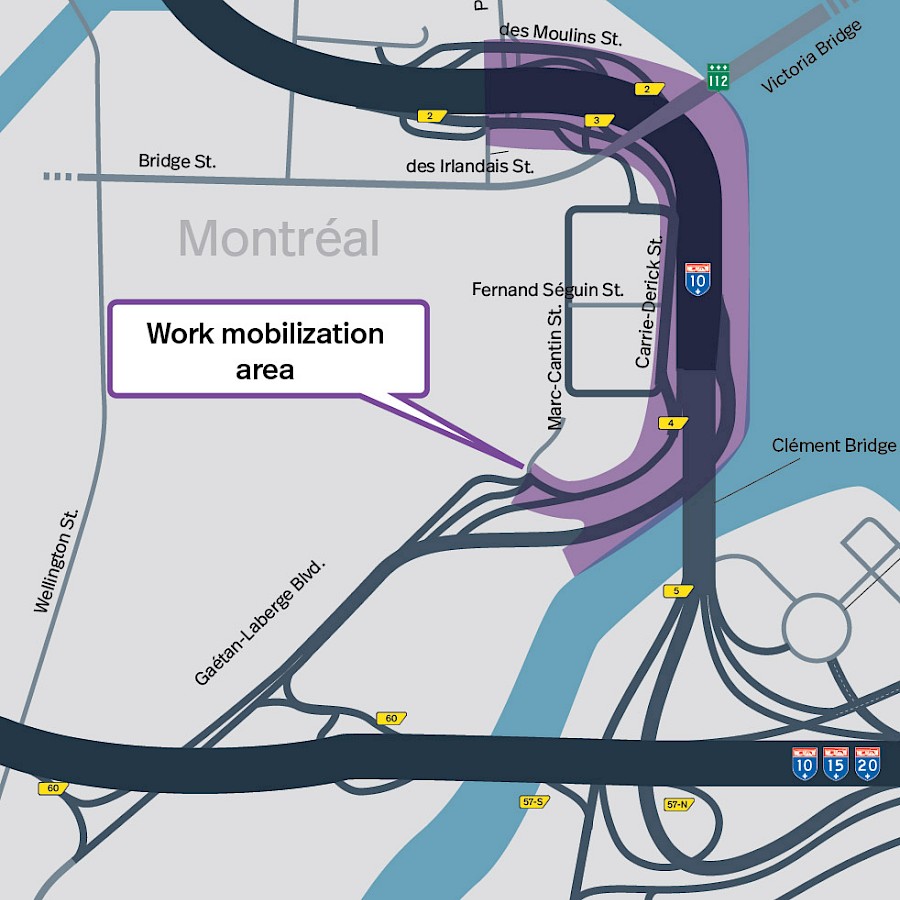 The work mobilization area will be located between the intersection of Marc-Cantin St. and Gaétan-Laberge blvd., to the east, and the intersection of Pierre-Dupuy Av. and Bonaventure Expy., to the west.